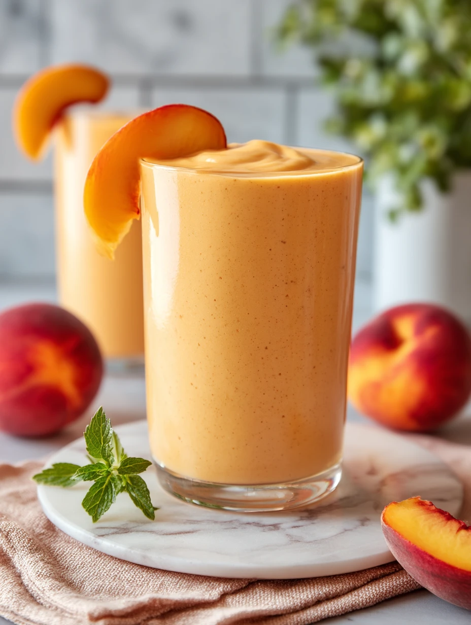 Pour into a chilled glass and garnish with a fresh peach slice if you’re feeling fancy. Enjoy immediately while cold and creamy!