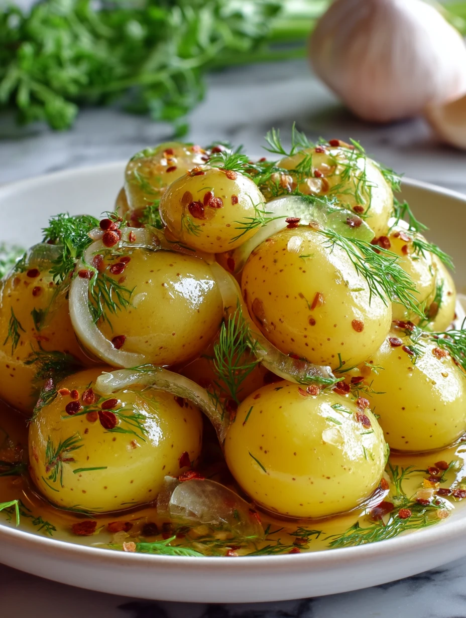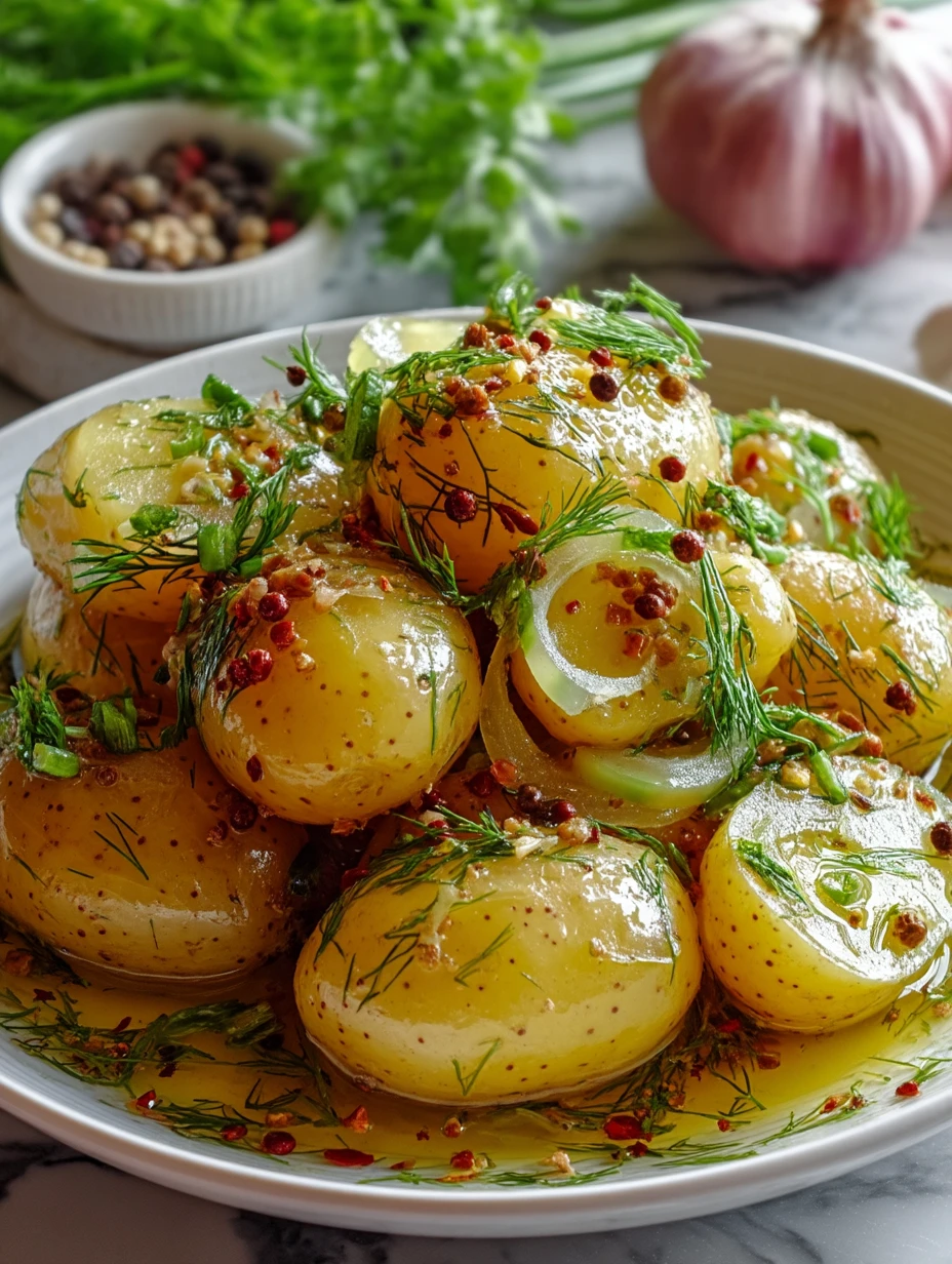 Before serving, give the potatoes a gentle stir so the brine, herbs, onions, and seasonings are evenly distributed. Taste and adjust with an extra pinch of salt, fresh dill, or red pepper flakes if needed.