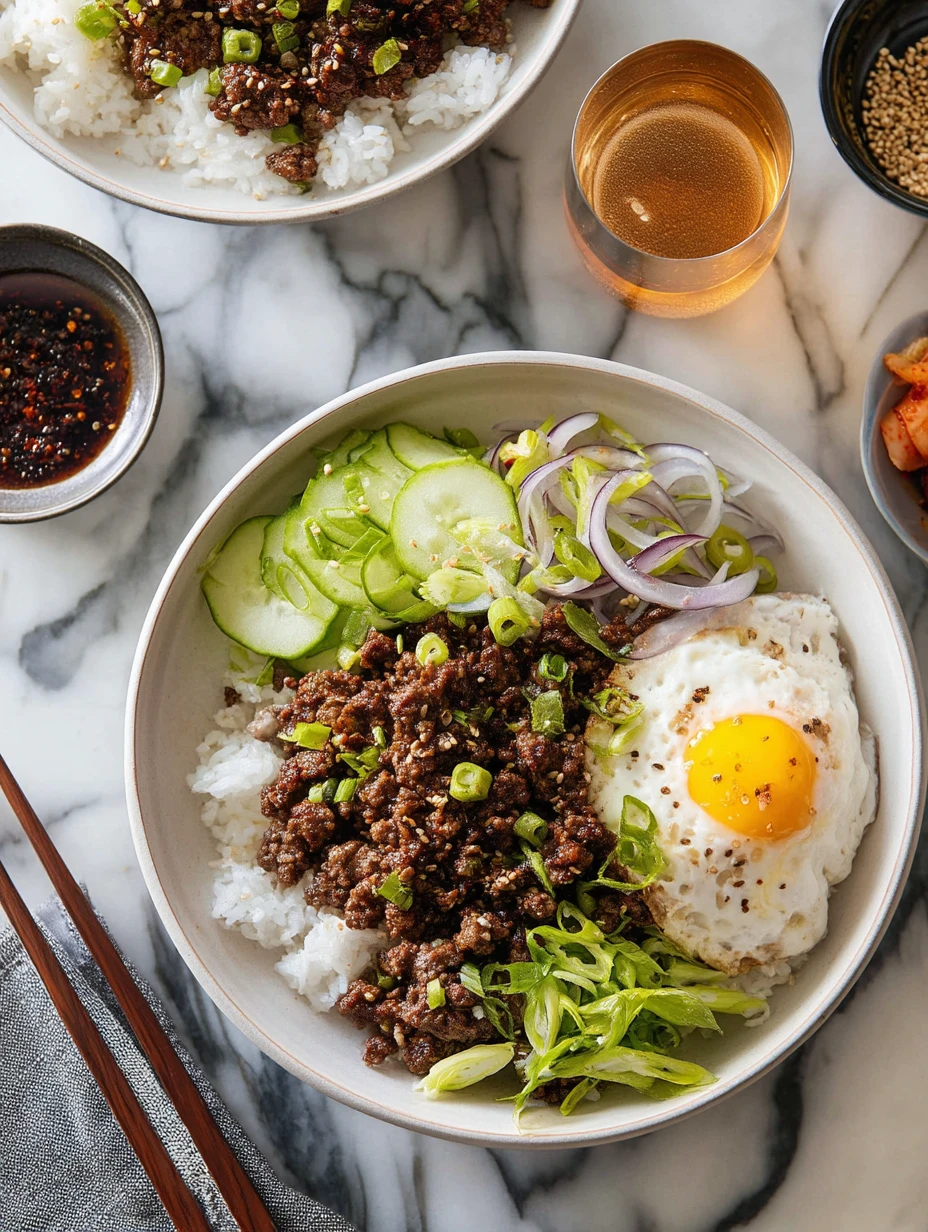 A fried egg on top makes this bowl feel extra comforting. When the yolk breaks into the rice and beef, the whole thing becomes even more luscious.