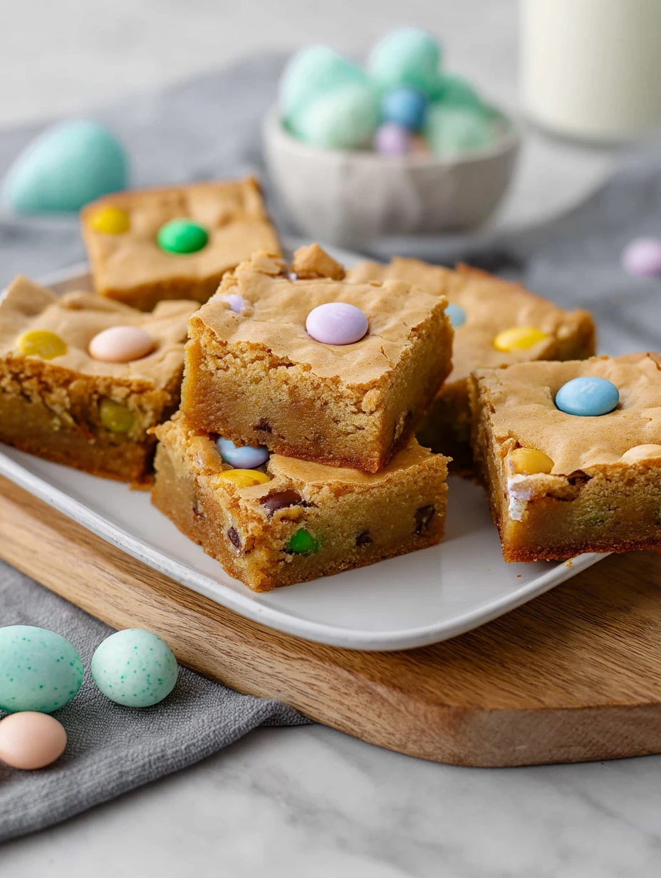 I love serving these blondies at room temperature when the centers are soft and chewy and the candy shells still have a little crunch. They are perfect on an Easter dessert platter, tucked into treat boxes, or served with coffee in the afternoon.
