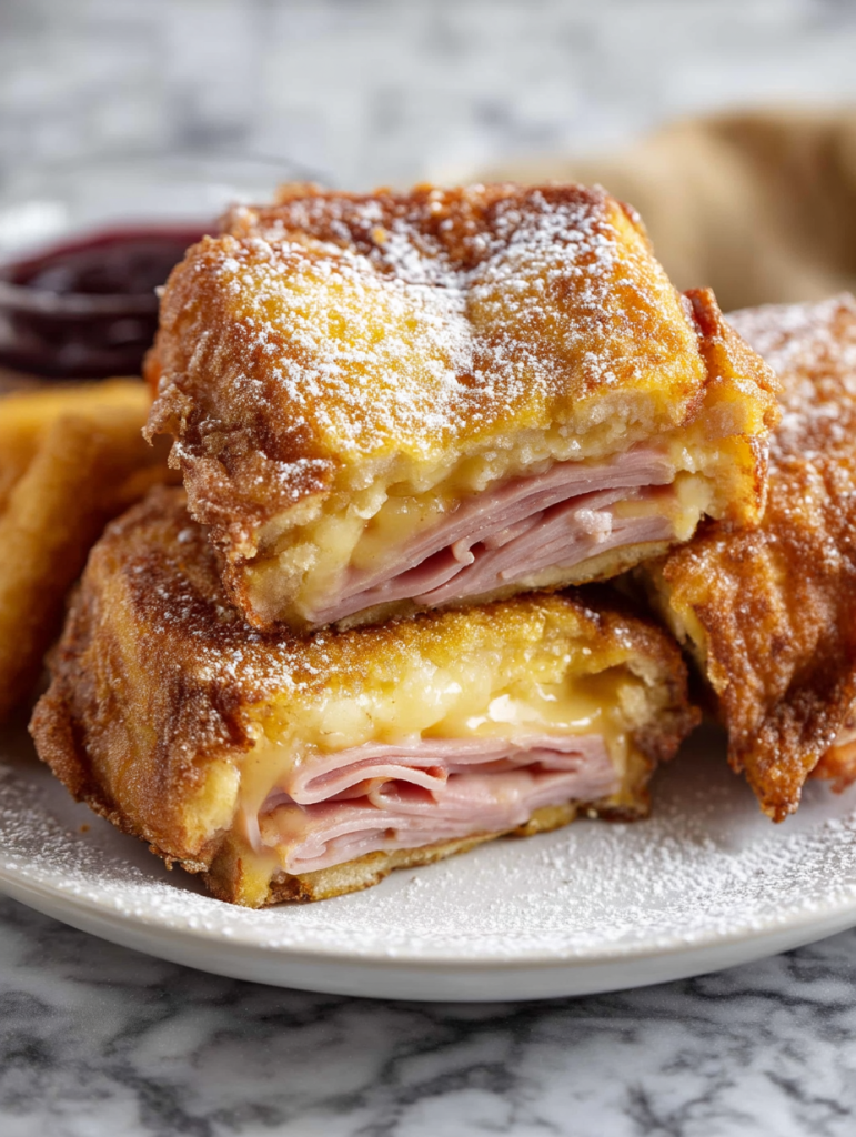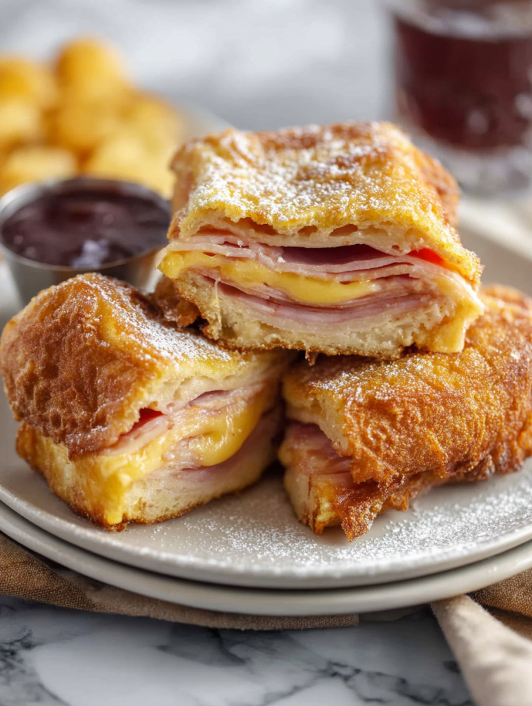 Monte Cristos are best enjoyed immediately while the crust is hot and the cheese is gooey. If you have leftovers, wrap them tightly in foil and reheat in the oven at 375°F for 10 minutes to retain crispiness. Avoid microwaving as it can make the bread soggy.