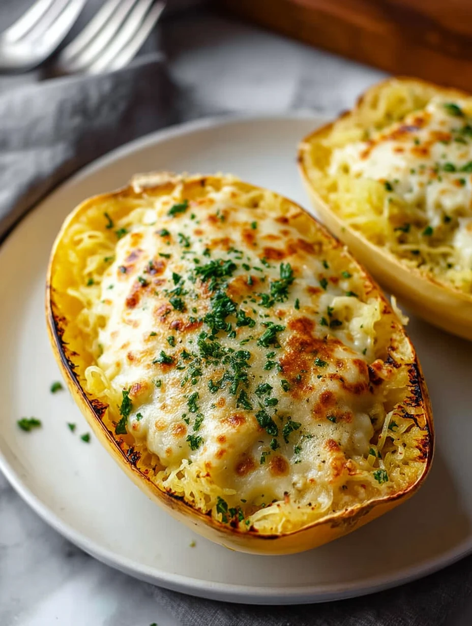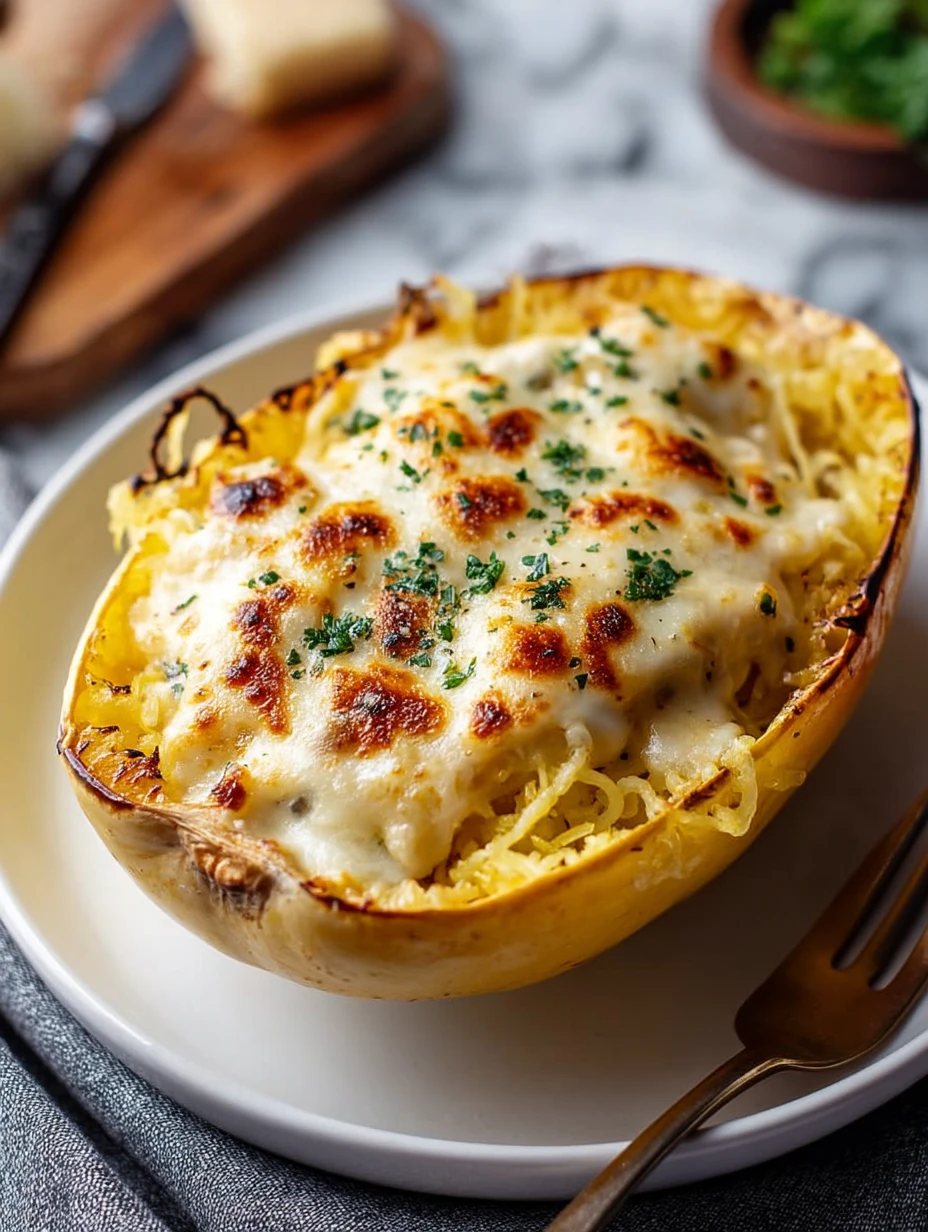 Roasted Spaghetti Squash With Alfredo Sauce and Cheese
