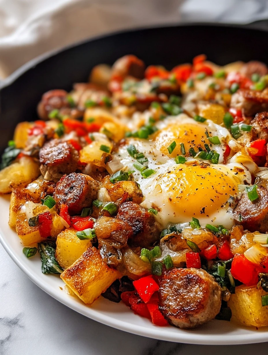 This Sausage Breakfast Skillet is the kind of hearty, satisfying breakfast that fuels your day right from the first bite. Golden potatoes crisped to perfection, savory sausage slices, and sweet bell peppers all tucked under a bubbling layer of melted cheese. It’s the perfect one-pan meal that balances flavor, texture, and simplicity.