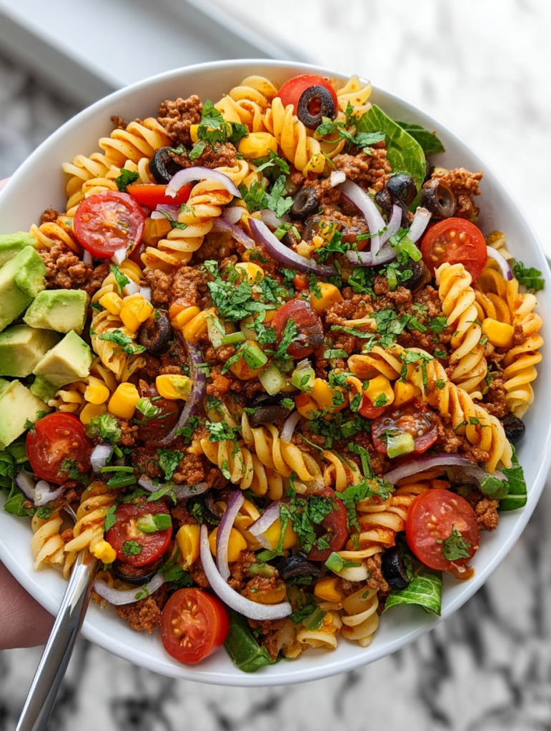 Each bite delivers seasoned beef, juicy cherry tomatoes, crunchy corn, black olives, sharp cheddar, and tender pasta spirals tossed in a zesty taco-style dressing. It’s a fiesta of textures and tastes, and it can be enjoyed cold or slightly warm, making it ideal for leftovers or make-ahead lunches. This is an easy recipe that will soon become a household favorite for taco lovers.