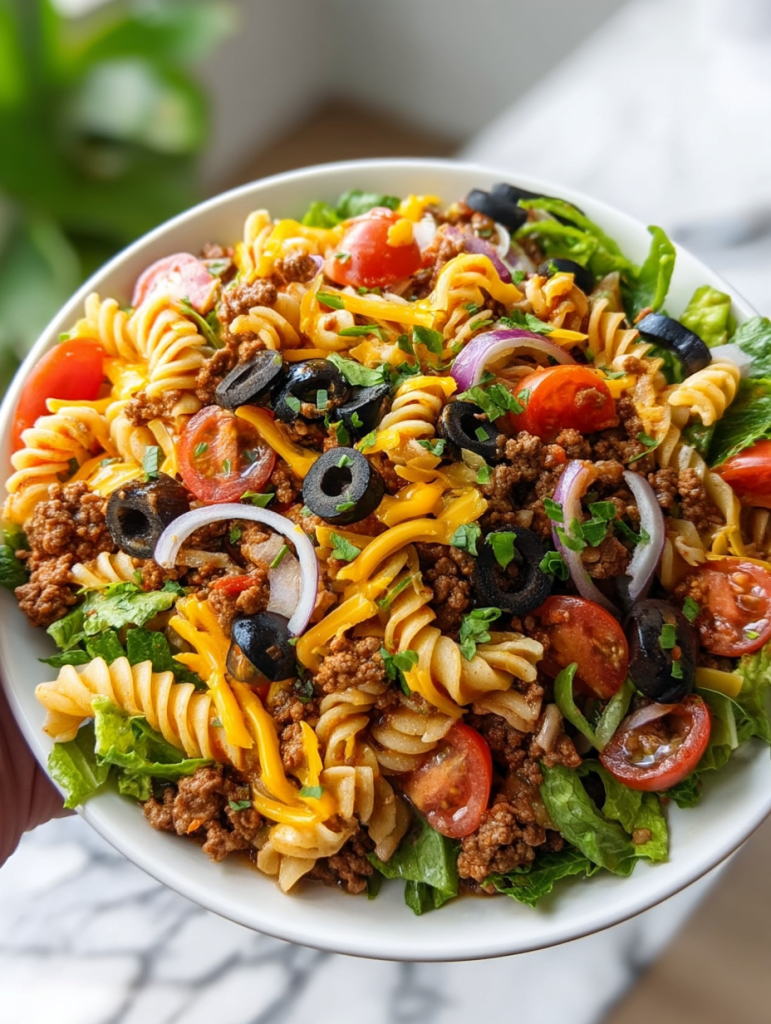 Get ready for a flavor-packed fusion of two weeknight favorites: tacos and pasta salad! This Seasoned Ground Beef Taco Pasta Salad Bowl brings together the best of both worlds in a bold, colorful, and satisfying dish. Loaded with taco-seasoned ground beef, spiral pasta, juicy cherry tomatoes, black olives, corn, cheese, and fresh herbs, this bowl is a vibrant mix of textures and tastes. Whether you’re planning a quick dinner, looking for easy lunch ideas, or need a party-ready side, this easy recipe ticks all the boxes. It’s one of those healthy snacks or dinner ideas that’s equally comforting and refreshing—great for busy nights or weekend fun. Ideal for those who love food ideas with flair!