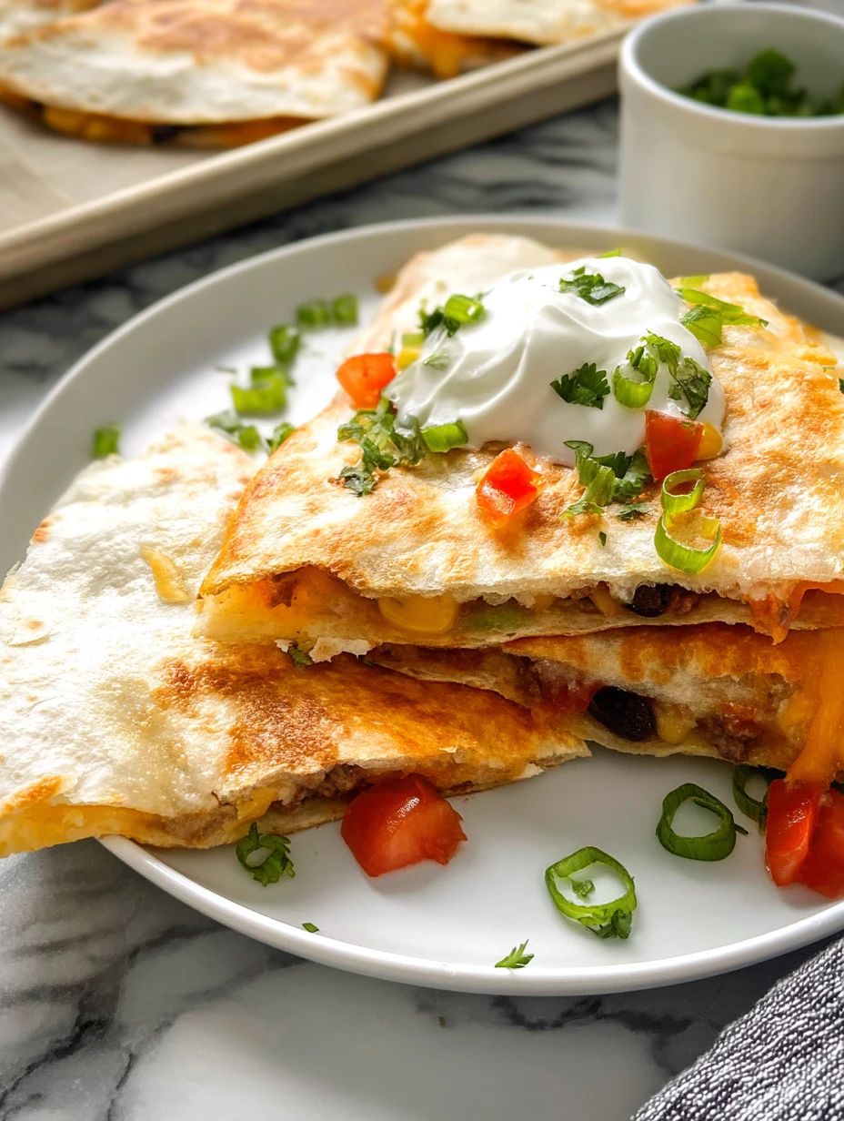 I like serving these straight from the pan while the cheese is still hot and stretchy. A spoonful of sour cream, a little salsa, and a scattering of green onions give the quesadillas a fresh finish and make the plate look complete. They are great for dinner, but I also think they are one of the easiest party foods because I can slice them small and let everyone grab a piece.