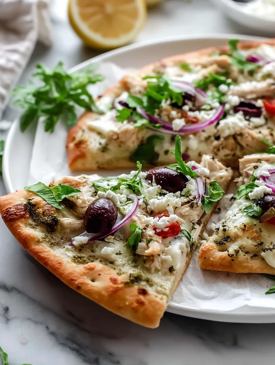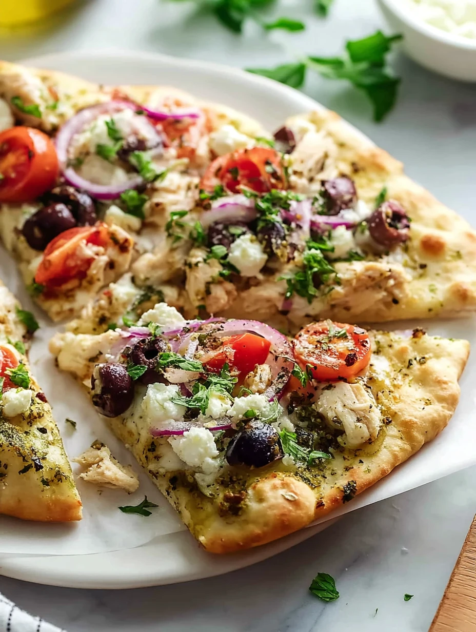 Top with the cooked chicken, halved cherry tomatoes, thinly sliced red onion, Kalamata olives, and crumbled feta. Try to distribute everything evenly so each slice gets a little of every flavor.