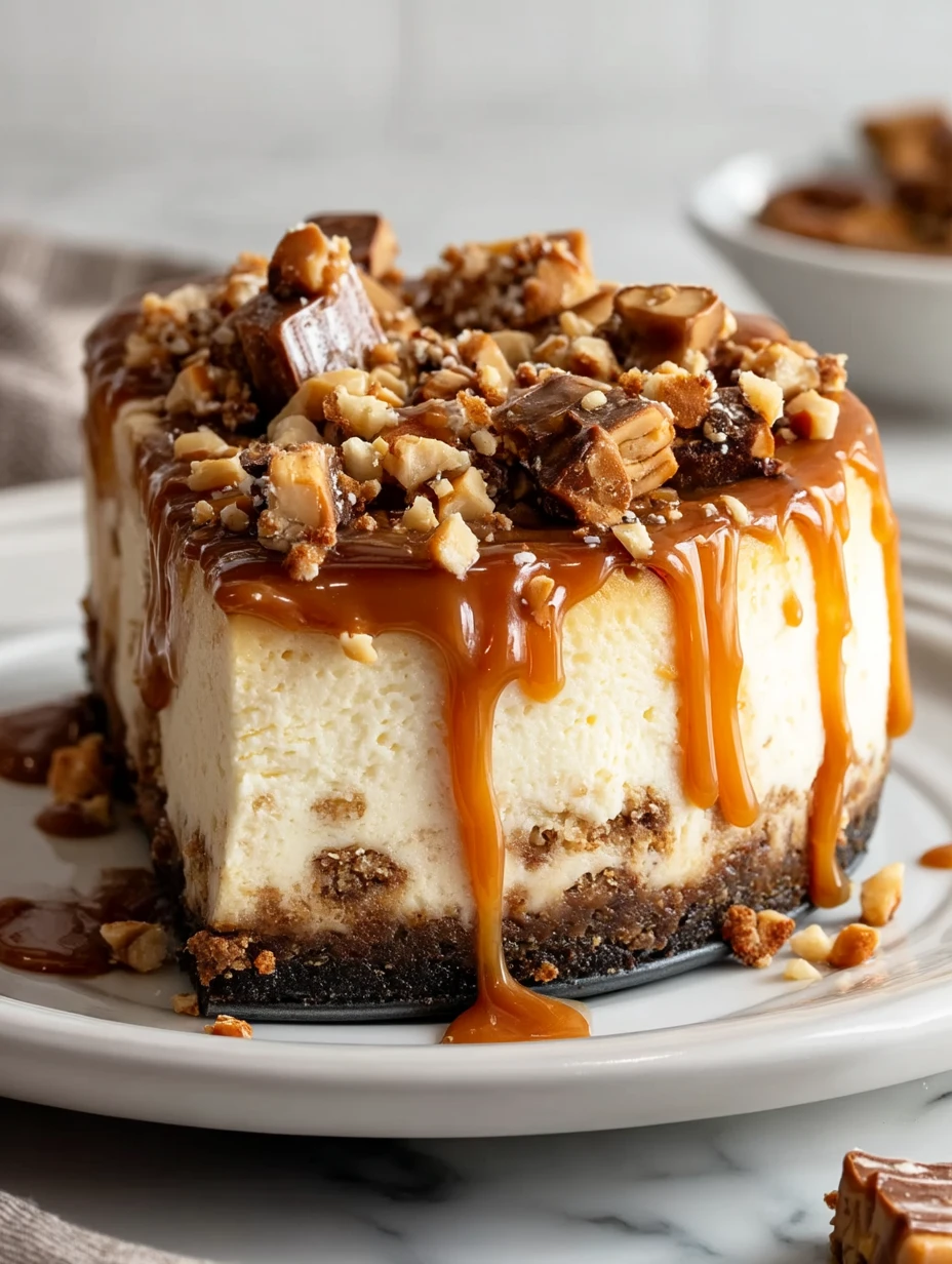 Imagine sinking your fork into a luscious, creamy cheesecake that’s studded with chunks of Snickers bars, layered over a buttery graham cracker crust, and finished with a luxurious salted caramel drizzle. Every bite is a rich symphony of sweet, salty, and nutty flavors with just the right amount of chocolate to make it utterly irresistible.