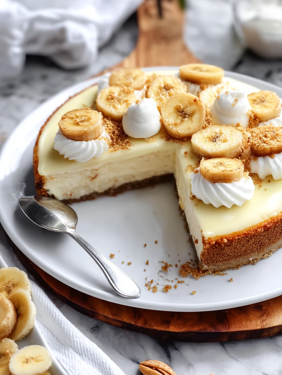Keywords: banana pudding cheesecake, banana cheesecake dessert, easy cheesecake recipe, party dessert, holiday dessert, baked cheesecake, vanilla wafer crust, banana pudding dessert