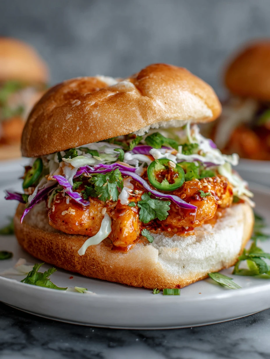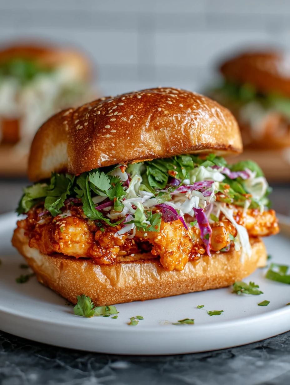 8. Spread Bang Bang sauce on the bun, add crispy chicken, slaw, and top with more sauce. Close the sandwich and serve hot.