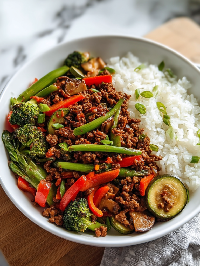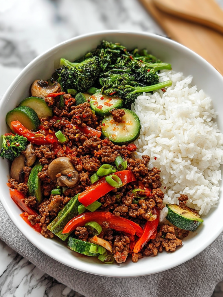 Looking for a quick and satisfying dinner idea that’s full of flavor and nutrition? This Spicy Ground Beef Stir-Fry Bowl with Garlic Veggies & Steamy Rice is the answer. It combines lean seasoned beef, sautéed fresh vegetables like zucchini, red bell pepper, and mushrooms, all served over fluffy rice. It’s perfect for busy weeknights, healthy meal prep, or a filling lunch. Whether you’re craving spicy comfort food, need a new weeknight recipe, or just want a hearty protein-packed meal, this bowl checks all the boxes. A delicious, balanced, easy recipe that brings restaurant-quality to your table at home. Great for dinner ideas, quick lunch bowls, or healthy food inspiration!