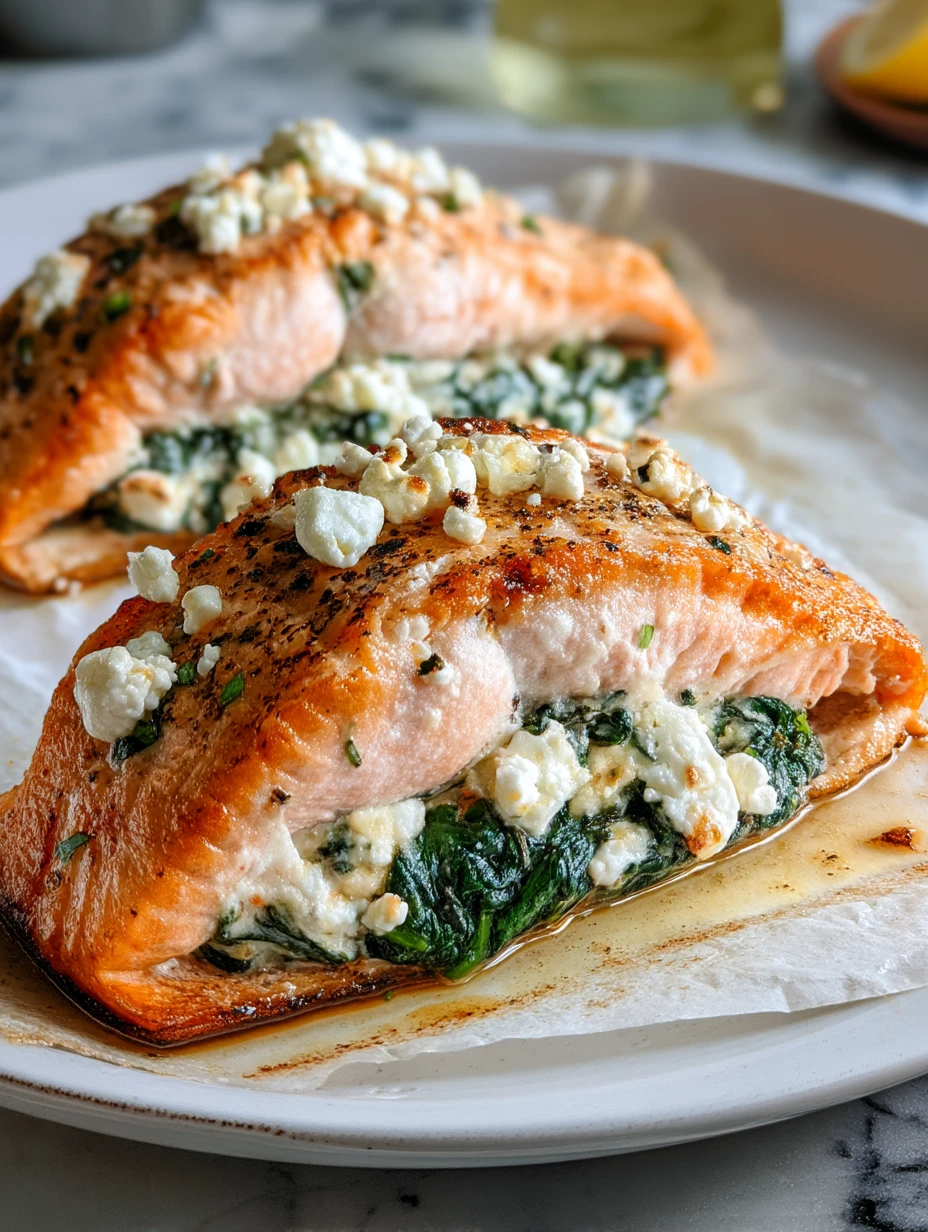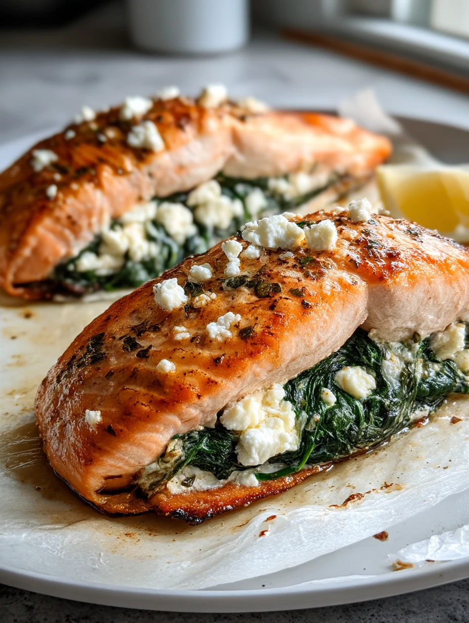 Fresh, skin-on salmon fillets work best for this dish, ideally center-cut so they’re thick enough to stuff. Skinless fillets also work, but may be more delicate to handle once slit and filled. Aim for high-quality salmon—wild-caught if possible—to get that buttery richness that pairs so beautifully with spinach and feta.