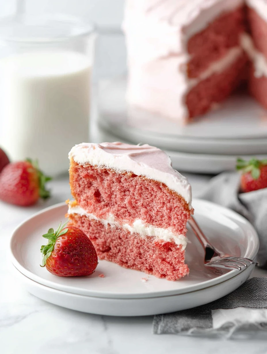 Strawberry Cake is best served slightly cool or at room temperature, depending on how soft you like your frosting. I usually take it out of the fridge about 20 minutes before serving so the cake feels tender and the frosting tastes extra creamy.