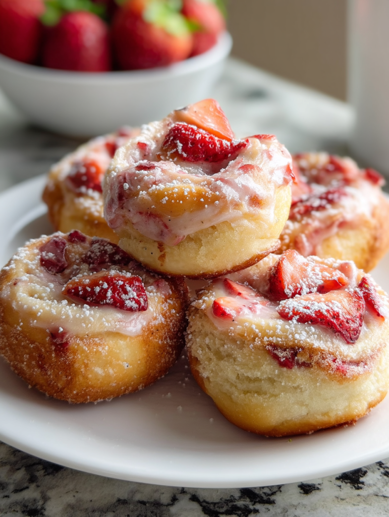These golden, fluffy Strawberry Donut Rolls are the ultimate morning indulgence. Imagine pillowy-soft donuts topped with fresh macerated strawberries and a delicate powdered sugar dusting. Perfect for brunch spreads, quick breakfast ideas, or sweet snack cravings, they offer a homemade twist that’s both nostalgic and gourmet. Whether you’re looking for a crowd-pleaser or a simple but impressive dessert, this easy recipe delivers it all. Great for any season, especially spring and summer, these donut rolls check every box: easy to make, food ideas that feel special, and a breakfast treat worth repeating.