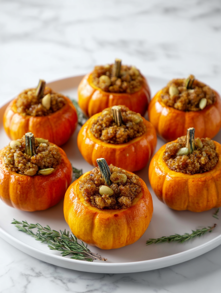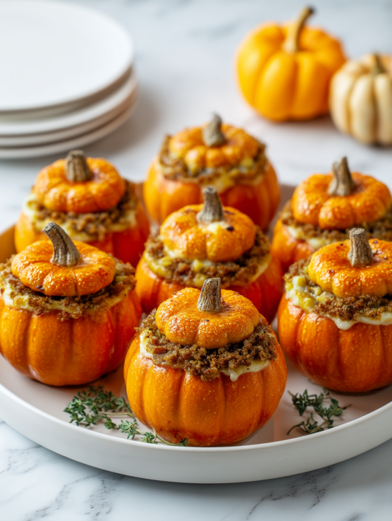 Ideal for fall dinners, Thanksgiving, or even as a unique appetizer for a dinner party, these little pumpkins are as tasty as they are cute. Each bite brings together sweet roasted pumpkin with hearty stuffing that’s packed with flavor and warmth.