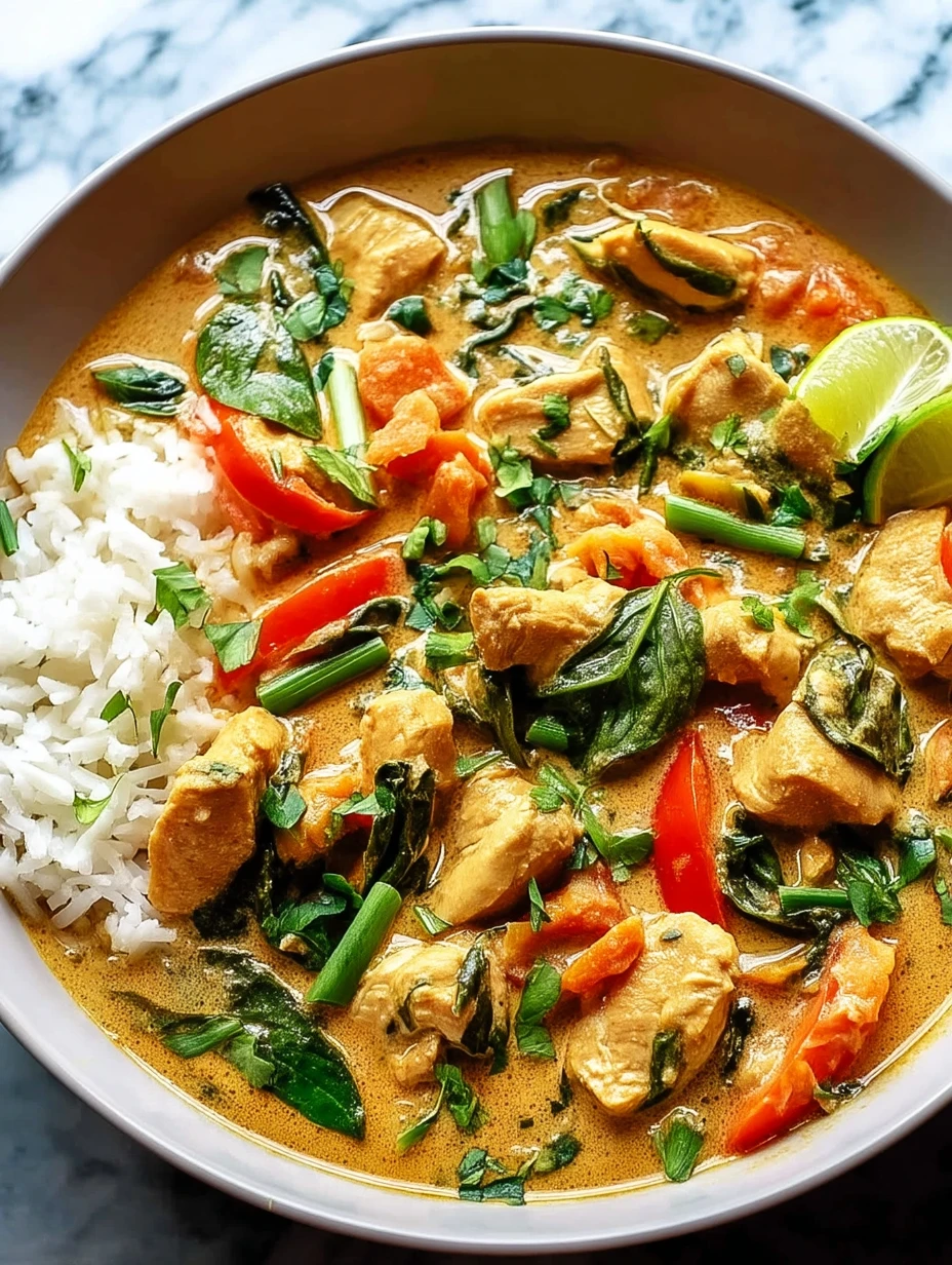 If you’re craving a meal that’s bold, creamy, and full of comfort, Thai Chicken Coconut Curry checks all the boxes. This vibrant dish combines tender chicken pieces simmered in a rich coconut milk sauce infused with red curry paste, garlic, and ginger. It’s spicy, slightly sweet, and incredibly fragrant—the kind of meal that turns any weeknight into something special.