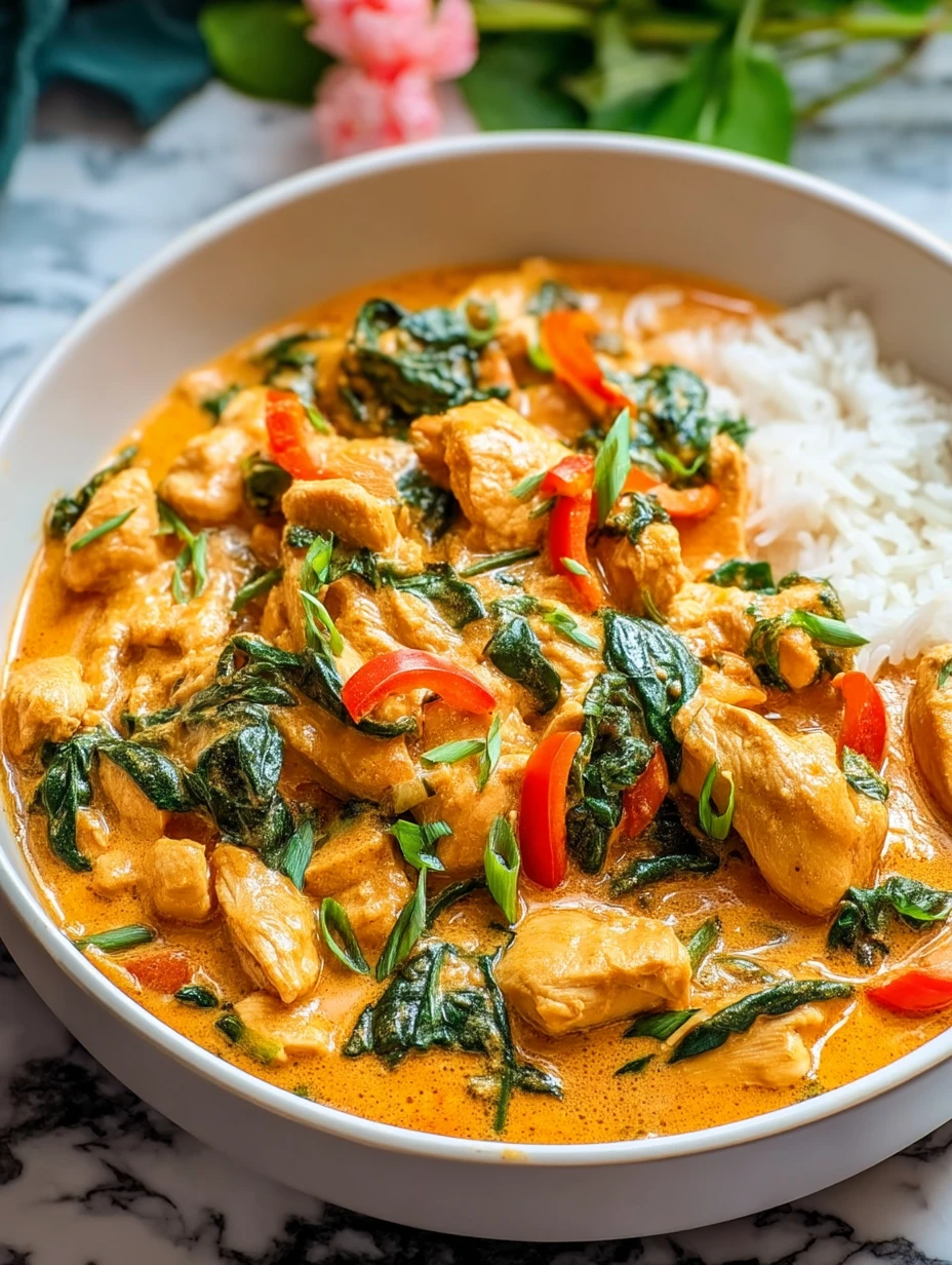 What sets this curry apart is its balance. The heat of the red curry is softened by the smoothness of the coconut milk, while fresh vegetables like bell peppers and spinach add color and a nutritional boost. It’s a one-pan wonder that’s both satisfying and nourishing.