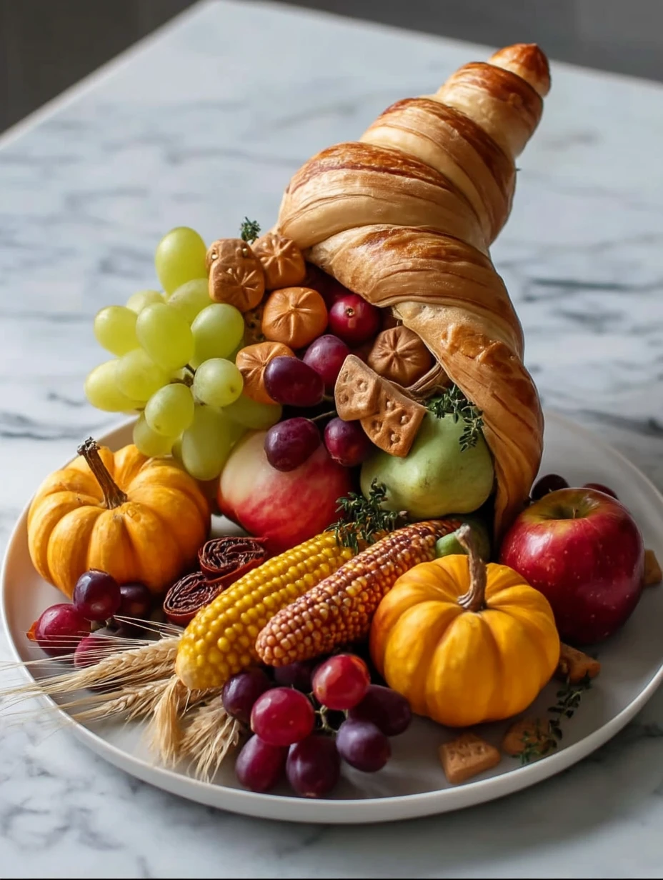 Make your holiday table unforgettable with this Thanksgiving Cornucopia Centerpiece—an edible arrangement that doubles as both decor and appetizer. This stunning bread-based horn of plenty is golden, crisp, and filled to overflowing with colorful fruits, cinnamon rolls, crackers, nuts, and more. Whether you’re hosting Thanksgiving, Friendsgiving, or a fall harvest gathering, this centerpiece brings charm and deliciousness to your event. It’s a creative yet easy recipe idea for anyone looking to combine festive presentation with edible artistry. Perfect for easy entertaining, fall food ideas, or a new twist on traditional centerpieces.