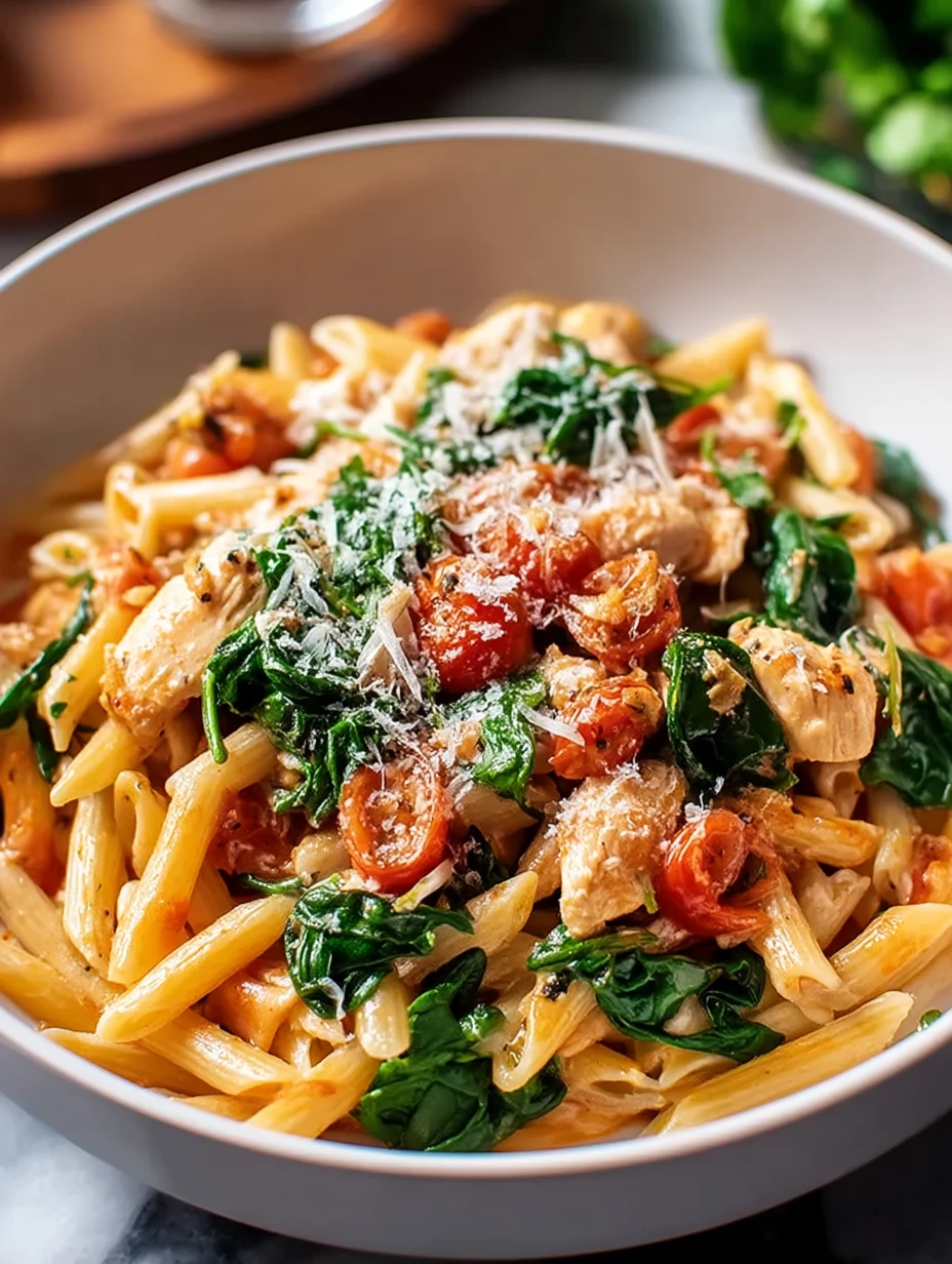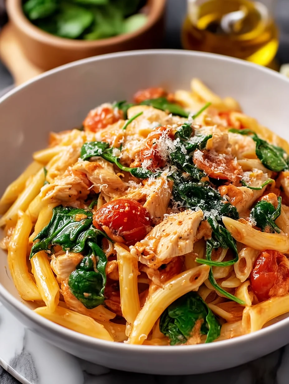 What I love most is how naturally this dish comes together. The sauce clings to every piece of pasta, the chicken adds hearty bite, and the spinach softens into the warm tomato base in the best way. It tastes like the kind of meal I would order at a casual Italian spot, but I can pull it off right at home with simple pantry ingredients.