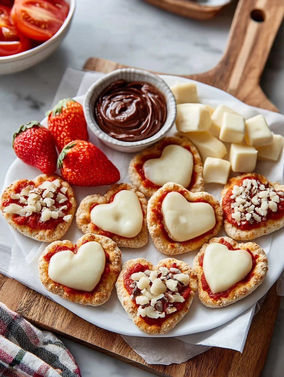 What makes this one such a winner for me is how easy it is to dress up simple ingredients into something memorable. The heart-shaped mini pizzas steal the show with their bubbly mozzarella and rich pizza sauce, and once they are arranged on a board, the whole thing looks charming enough to serve for a celebration.
