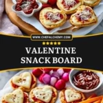 Keywords: Valentine Snack Board, valentine appetizer, mini heart pizzas, easy appetizer, party snack, holiday snack board, kid-friendly dinner, easy recipe, snack board ideas, appetizer board