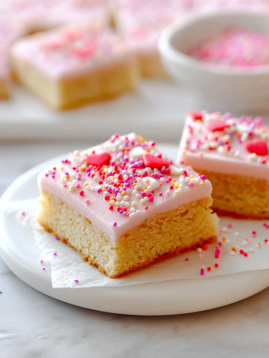 Soft, thick, bakery-style sugar cookie bars topped with a cloud of pink frosting and a shower of sprinkles—this is my idea of a perfect Valentine’s Day treat. When I pull a pan of these out of the oven, the whole kitchen smells like vanilla, butter, and a little bit of holiday magic.