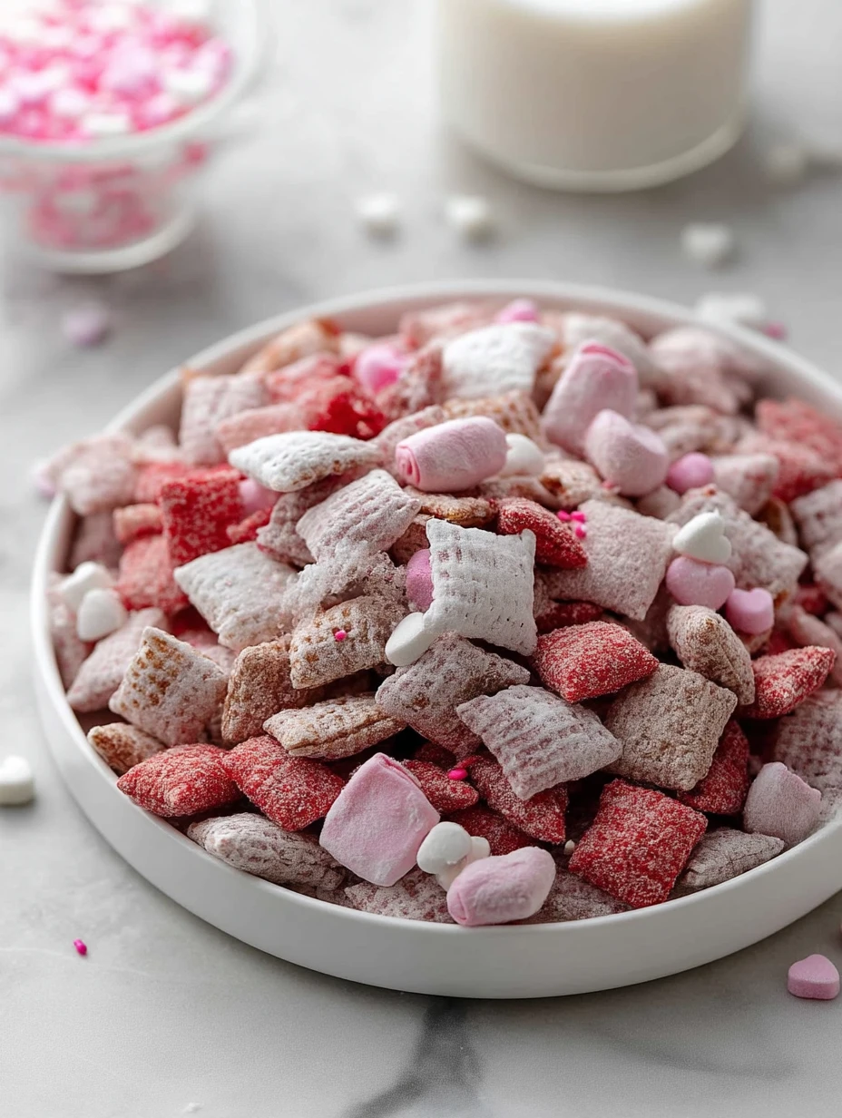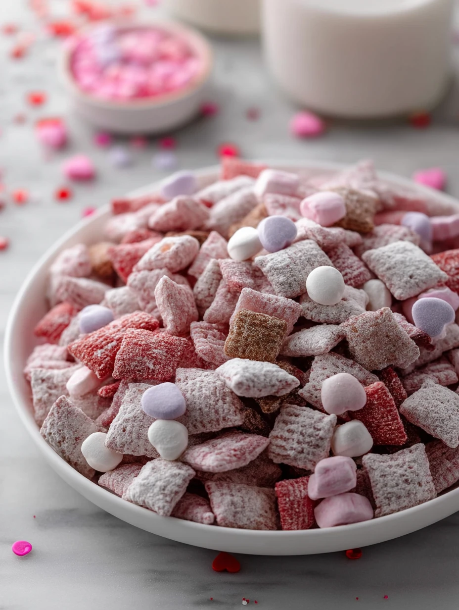 I love making sweet little snack mixes for holidays, and this Valentine’s Day Muddy Buddies is one of the easiest treats I come back to every year. It has that classic puppy chow crunch from crisp cereal, a smooth white chocolate coating, and a generous dusting of powdered sugar that turns every handful into a festive bite.