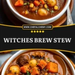 Serve Witches Brew Stew in rustic bowls with crusty bread or over mashed potatoes for extra comfort. For storing, cool completely and refrigerate in airtight containers for up to 4 days. It also freezes beautifully — just thaw and reheat gently on the stovetop.